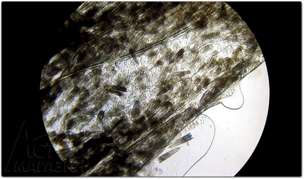 Первый препарат крыло домашнего вредителя – моли. Видно, что крыло покрыто большим количеством чешуек и щетинок, это является характерным признаком для данного отряда насекомых (нажмите на изображения для просмотра увеличенного изображения).
