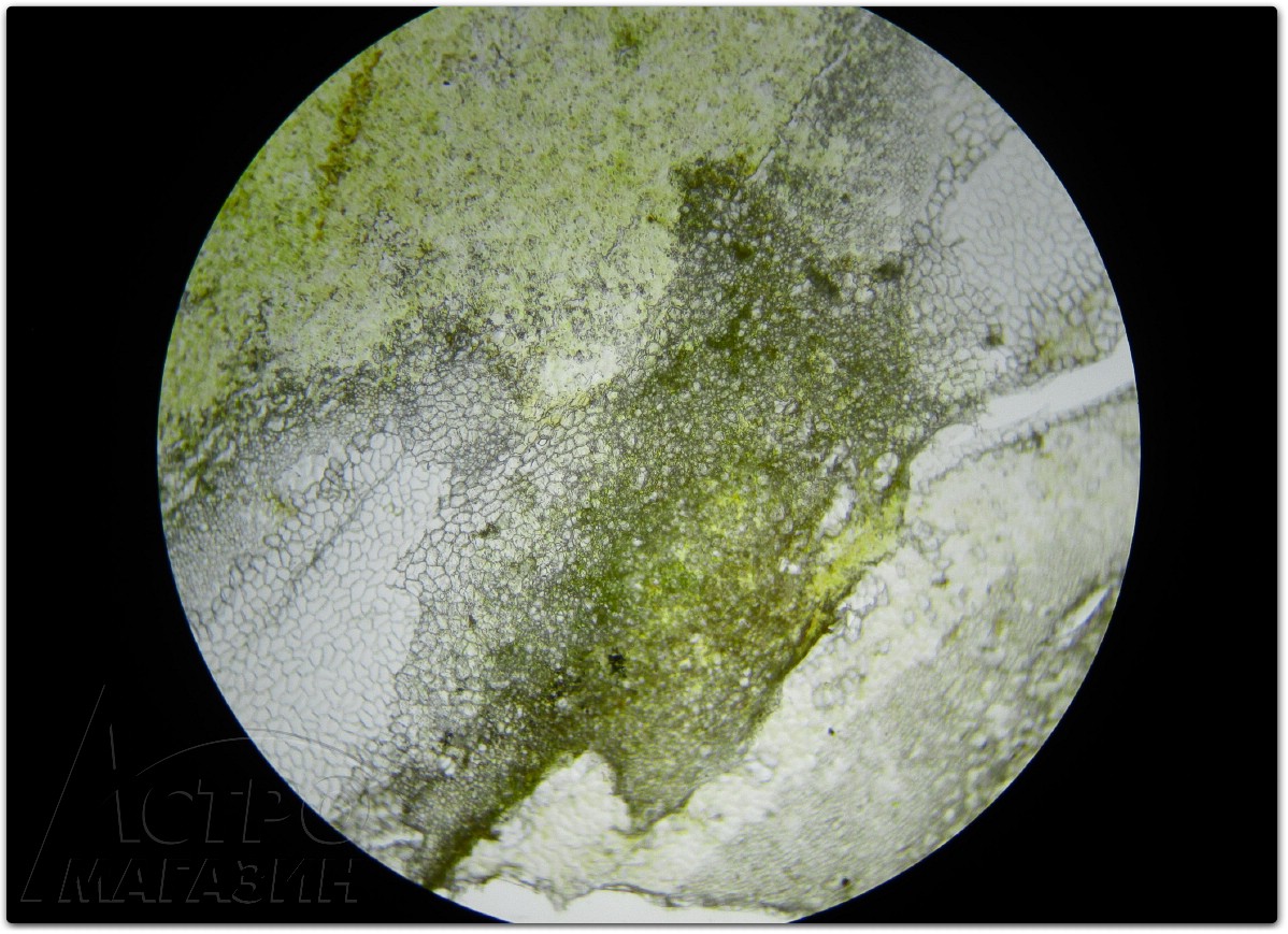 Последний препарат - это верхний слой листа декоративного домашнего растения, или эпидермис. Здесь хорошо различима форма растительных клеток и особенности их расположения. Также заметна устица - это две бобовидные клетки расположенные друг к другу, именно они обеспечивают газообмен растения с внешней средой и испарение воды.