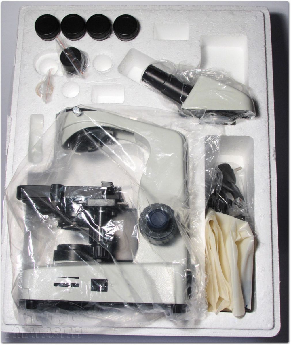Мне всегда симпатизировал данный производитель тем, что он не пытается попусту тратить деньги своих покупателей. Поэтому упаковка микроскопа совершенно непримечательна. В данном случае крупный картонный ящик, внутри которого в литой пенопластовой форме находится микроскоп и все принадлежности.