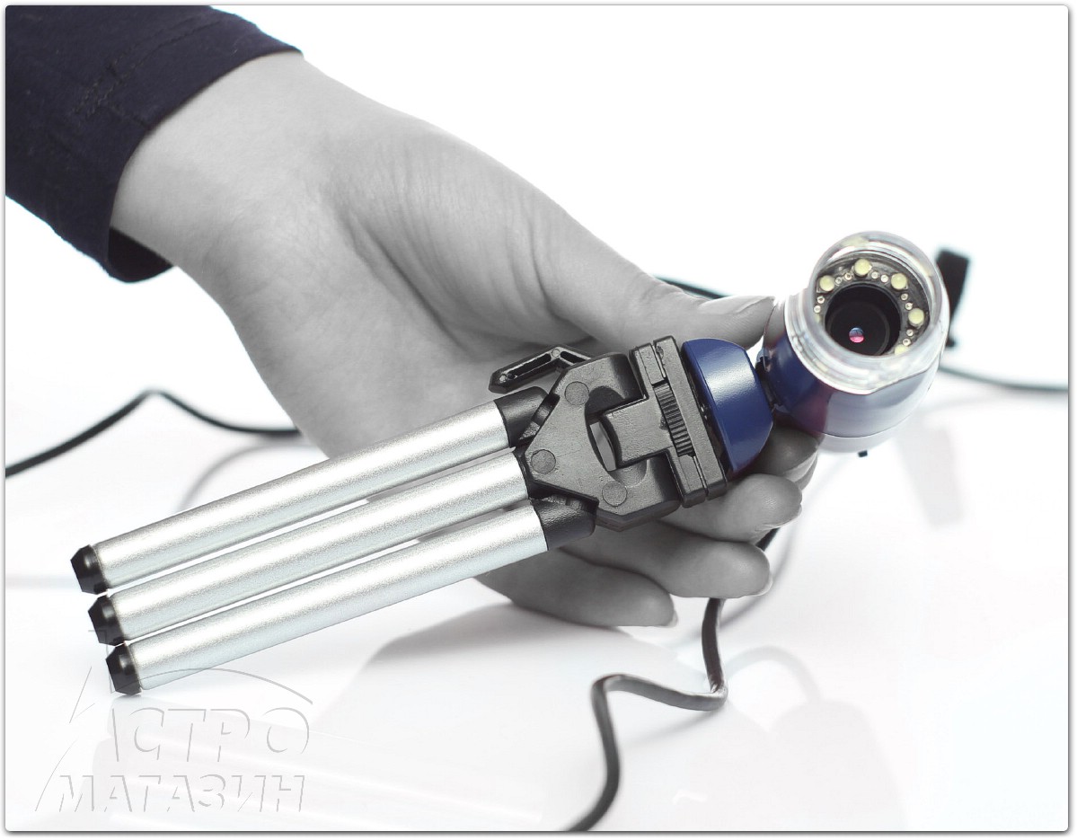 Комплектный штатив очень удобен и скорее всего его будет достаточно для большинства задач. Он имеет оригинальную настольную конструкцию и оснащён выдвижными ножками. Головка штатива имеет только одну степень свободы и легко фиксируется эксцентриком. В общем подобрать удобное положение для наблюдений будет несложно.