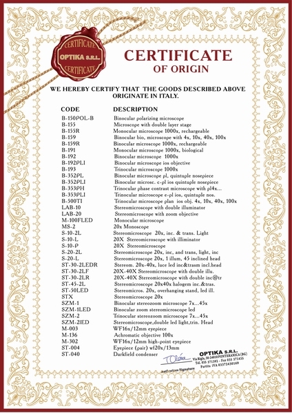 Вся продукция Optika SRL произведена в Италии. В небольшом городке Понтераника (провинция Бергамо) осуществляется разработка, производство и сборка микроскопов Optika. Каждый микроскоп сопровождается индивидуальным серийным номером, указанным на корпусе и в гарантийном талоне, а также отметкой о прохождении конечного контроля качества. Все изделия соответствуют основным требованиям соответствующих европейских директив ЕС и стандартам Европейского Союза.