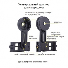 Дополнительно комплектация расширена за счет универсального адаптера для смартфона, позволяющего установить смартфон шириной от 55 до 98 см для съемки с помощью его камеры результатов наблюдений. Адаптер плотно фиксирует смартфон, не позволяя ему упасть во время наблюдений.
