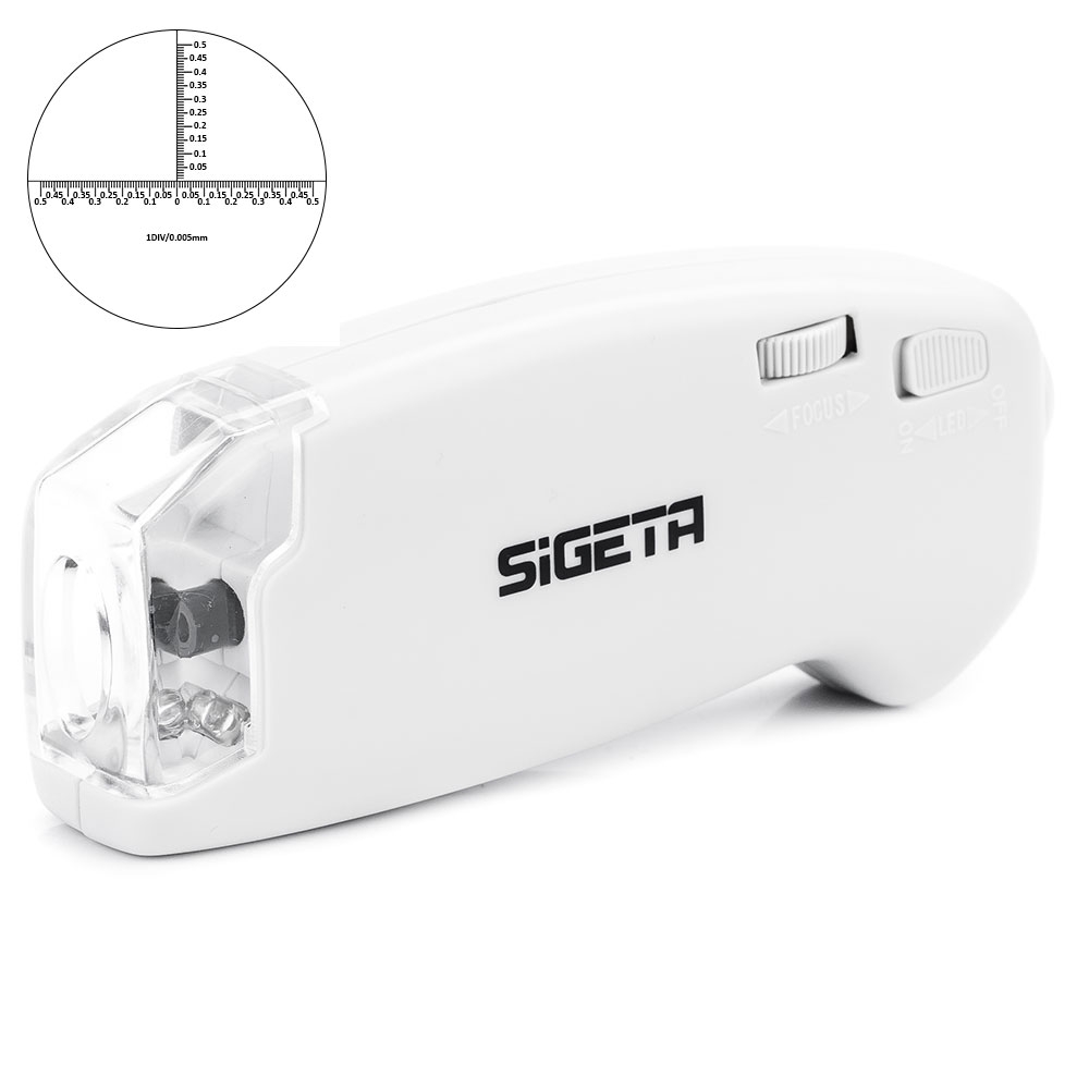 SIGETA MicroGlass 150x R/T (со шкалой) – легкий компактный микроскоп с возможностью проведения микрометрических измерений. Благодаря нанесенной на одну из линз микрометрической шкале и мощному увеличению 150x, можно узнать точные линейные размеры очень мелких объектов. Шаг разметки составляет всего 0,005 мм; в поле зрения микроскопа полностью помещается окружность диаметром 2,8 мм.