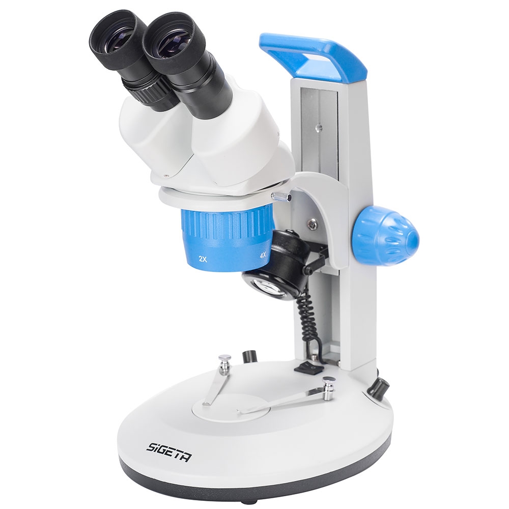Голова микроскопа имеет револьверную насадку на 2 пары объективов - на 2х и на 4х, которые меняются поворотным движением. В комплекте поставляется пара высококачественных широкоугольных окуляров 10х/20 с резиновыми наглазниками, которые в результате дадут 20х и 40х увеличения.