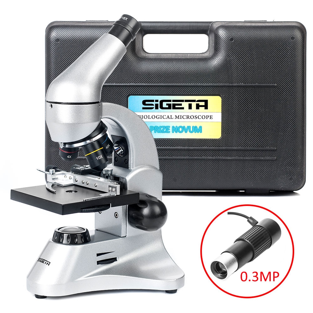 Микроскоп SIGETA PRIZE NOVUM 20x-1280x с камерой 0.3Mp (в кейсе) – школьный биологический микроскоп с цифровой камерой для записи фото и видео. Камера подключается к компьютеру через USB-порт, в комплекте поставляется диск с драйверами.