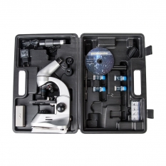 В комплект микроскопа входит набор готовых образцов и аксессуаров для исследований. Весьма умеренная цена, богатая комплектация и качественная оптика делает модель лидером среди микроскопов аналогичного класса.
