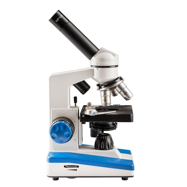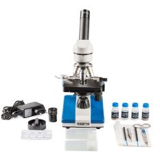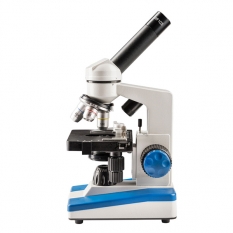 Микроскоп оборудован 3 объективами (4x, 10x, 40x) и имеет в комплекте два широкоугольных окуляра (10x и 16x). Наибольшее оптическое увеличение со стандартным набором составляет 640 крат. С таким увеличением Вы можете детально изучать строение клеток растений или животных, а также образцы тканей человеческого организма.