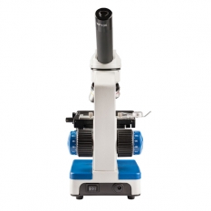 Еще одной важной особенностью данной модели является наличие под предметным столиком линзового конденсора с лепестковой диафрагмой и держателем светофильтров. Благодаря этому, есть возможность коррекции контрастности изображения, что переводит наблюдения на более высокий уровень. Микроскоп оборудован верхней и нижней LED-подсветками с плавной регулировкой интенсивности освещения. Освещение микроскопа может работать как от сети, так и от трех батарей типа АА, что делает этот микроскоп мобильным.