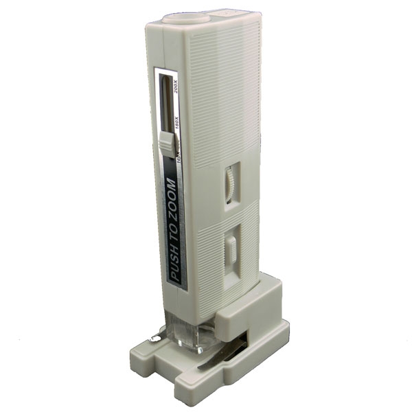 Карманный микроскоп на подставке с подсветкой и переменным увеличением 160х-200х. Фокусировка производится прокруткой колеса на корпусе, увеличение изменяется рычагом сбоку корпуса.
