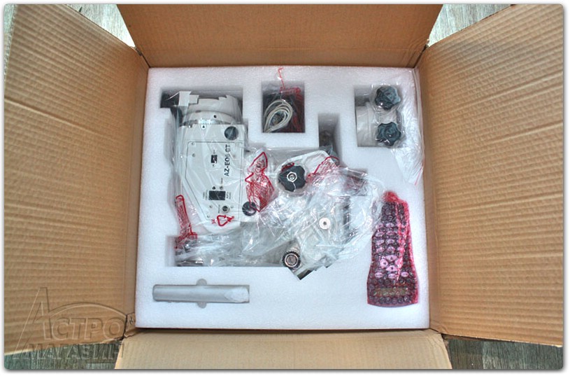 Под ней находится упакованная в полиэтиленовую пленку сама голова монтировки, аккуратно уложенная в паз соответствующей формы, а также пульт SynScan, кабели, удлинитель штанги противовесов, различные кабеля и набор шестигранных отверток.