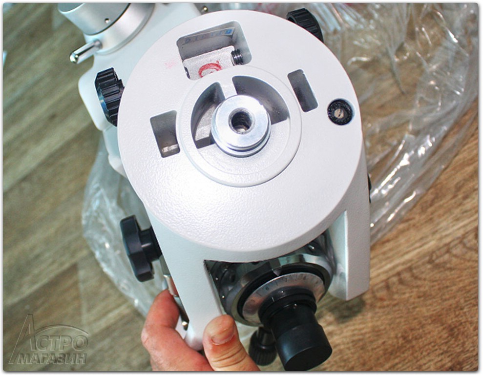 Для крепления головы монтировки к опорной площадке используется хорошо знакомый владельцам монтировок HEQ5 и EQ6 Pro специальный винт. Он снизу вкручивается в опорную площадку, а затем в голову монтировки. Резьба в опорной площадке нужна исключительно для того, что бы винт не выпадал, когда он не фиксирует голову. По своему опыту могу сказать, что литая резьба на опорной площадке со временем разрушается. Вполне вероятно, что так случится и в данном случае. Ведь здесь производитель не внес каких-то существенных корректив. Впрочем, отсутствие данной резьбы не усложняет использование монтировки.
