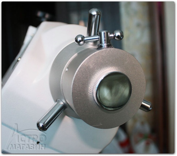 3) Зажим оси склонений выполнен в виде удобного винтового колеса, легко находимого на ощупь в темноте. Достаточно удачен и зажим по оси прямого восхождения, что позволяет не ошибиться при поиске зажимов.
