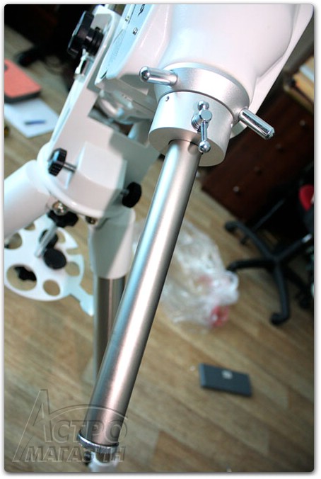 Процесс установки головы на треногу осуществляется практически также, как и более ранних монтировок. Нужно ослабить винты регулировки азимута полярной оси и установить голову на площадку так, что бы штырь верхней площадки треноги оказался расположен между винтов. После этого в головку ввинчивается длинный винт снизу.