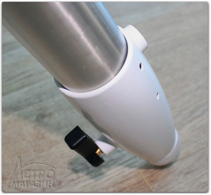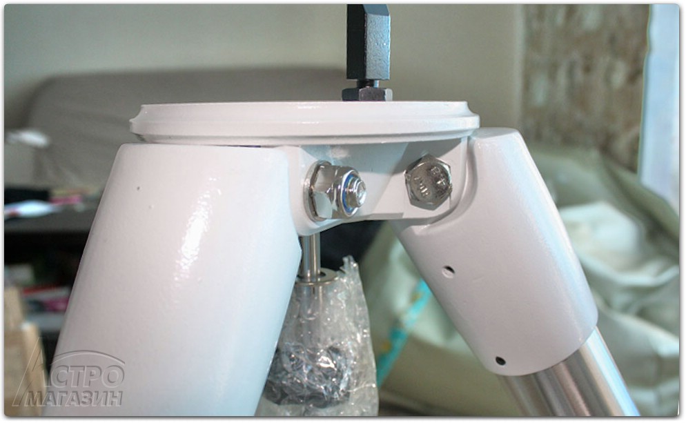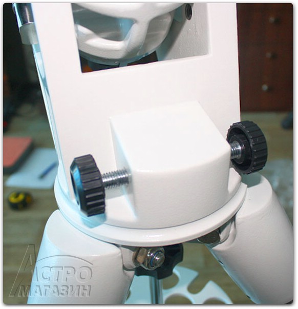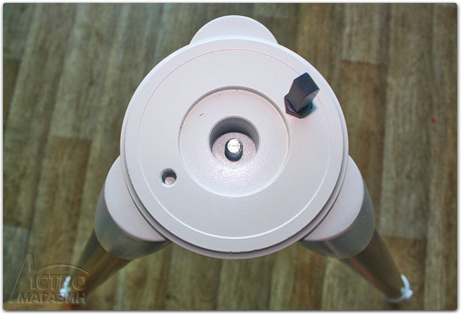 "Ноги" монтировки прикреплены в верхней части к опорной площадке для крепления головы. Для фиксации головы по азимуту в данной модели на площадку вкручен специальный металлический штырь, окрашенный черной краской. При необходимости, его можно переставить на противоположную сторону, где для этого предусмотрено отверстие с резьбой. Такое решение, в отличие от литого штыря на более старых монтировках, позволяет гибче подходить к установке головы в зависимости от геометрических размеров трубы навешиваемого телескопа широты местности или в условиях стесненного пространства.