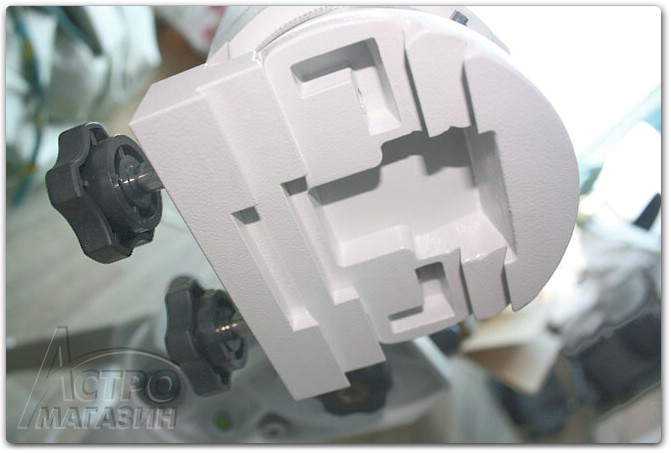 Внешний вид распорки также хорошо знаком владельцам компьютеризированных монтировок. Она поставляется упакованной в пузырчатую пленку. По совместительству распорка работает и полочкой для аксессуаров. Действительно, в отверстия полочки можно вставить 5 окуляров с посадкой 1.25" и 2 окуляра с 2" посадкой. Но лично мне кажется, что монтировки такого уровня редко используются для визуальных наблюдений, да и окуляры в наших условиях могут покрыться влагой за короткое время бездействия. Впрочем, кому-то эта полочка наверняка пригодится.