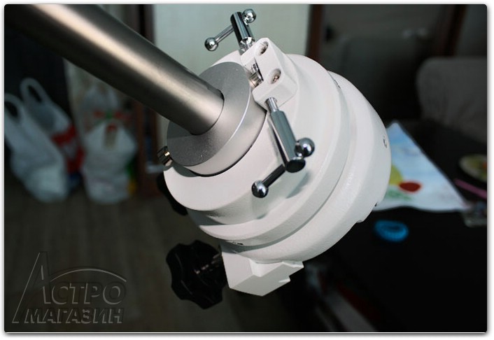 Настройка полярной оси по азимуту стандартна. Для этого предназначены две ручки поворота головы монтировки по азимуту. Диапазон регулировки составляет около 9 градусов и является вполне достаточным.