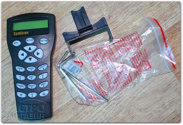 Управляется монтировка уже хорошо известным нашим любителям пультом управления SynScan, идущем в комплекте. К сожалению, пока отсутствует вариант монтировки в формате SynTrek с более простым и дешевым пультом. Очевидно, производитель предполагает, что стоимость пульта для такой монтировки представляет собой не существенную величину и на нем нет смысла экономить. На фото с пультом мы видим также идущий в комплекте набор шестигранных ключей.