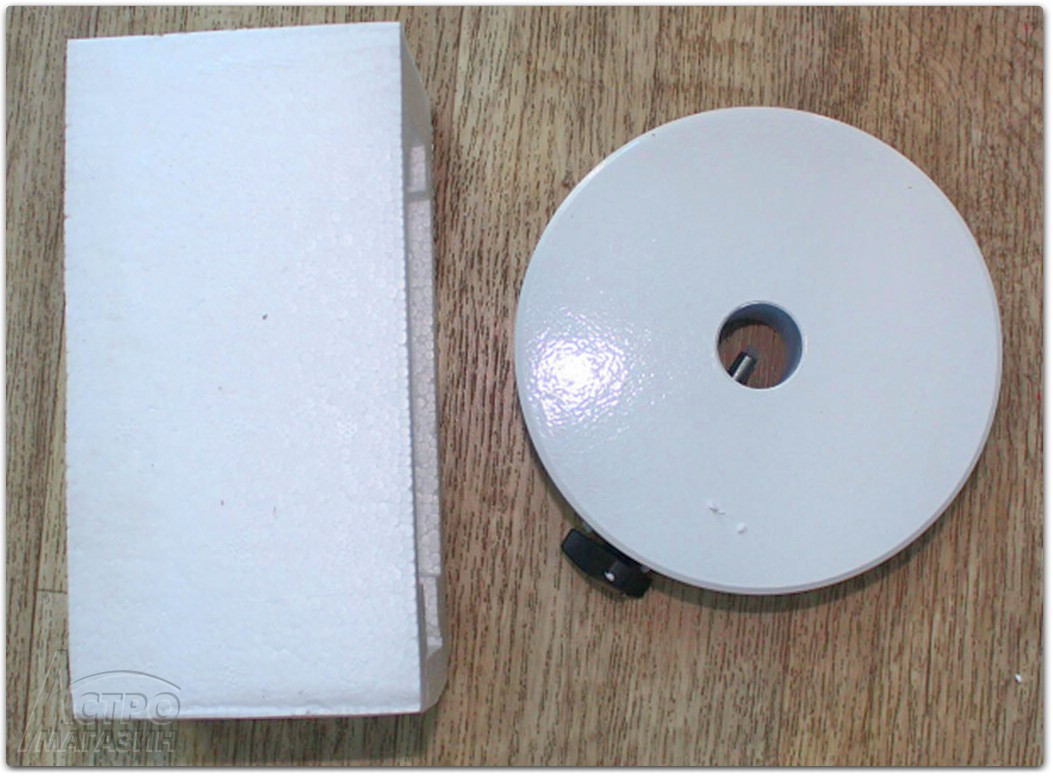 Противовесы уложены в пенопластовые ложе. Вес каждого противовеса составляет около 5 килограмм. Увы взвешивание пришлось выполнять на простых напольных весах и ошибка на 100-200 грамм вполне возможна. Диаметр противовесов составляет 15 см, а толщина у них 41.5мм. Диаметр внутреннего отверстия противовесов составляет 25.3мм, и эта величина отличается в большую сторону по сравнению с ранее применявшимися в прежних монтировках. Это значит, что противовесы обычной EQ6 и новой монтировки взаимонезаменяемые.