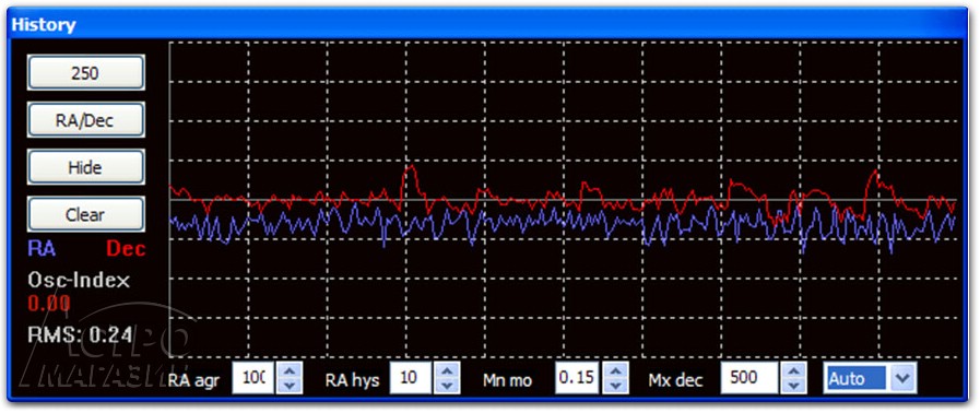 Если же использовать автогид, то кривая отклонений становиться совсем замечательной. Среднеквадратичное отклонение не превышает 0.49" по обеим осям. На иллюстрации ниже изображен график в случае, наиболее неблагоприятном, когда двигатель по склонению не тянет несбалансированную трубу, а толкает ее. Фокусное расстояние гида - 72см, то есть, на пиксель приходится около 2". В начальной части графика виден характерный пик на графике. Это с дополнительной трубы был снят гид. Трудно себе представить, каким большим был бы скачок при использовании более простых монтировок.