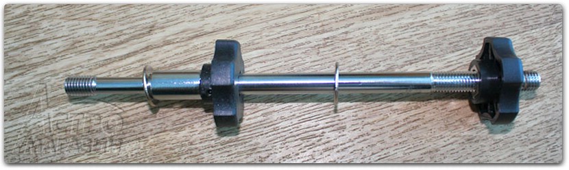 Диаметр штанги противовесов - 25мм. Это больше, чем у монтировки EQ6 Pro и благодаря этому жесткость существенно повысилась. Как я уже упоминал, из-за этого для балансировки старые противовесы непригодны и необходимо использовать новые, идущие в комплекте. Длина штанги противовесов в выдвинутом состоянии 21см. Из них 20.5см приходятся на саму ось, а 0.5 см занимает фиксирующая гайка. При необходимости, можно удлинить ось с помощью дополнительного удлинителя, идущего в комплекте, на 15 см.