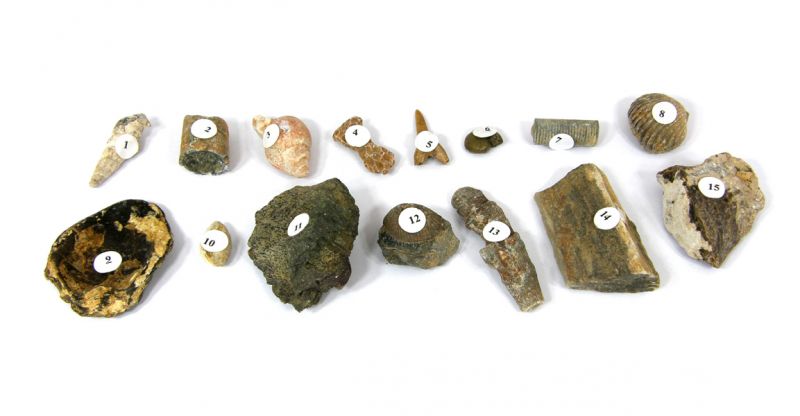 Коллекция из 15 разных окаменелостей собранных вручную в США и Мароко. Поставляется в пластмассовом кейсе с перегородками.