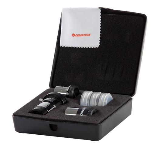 Набор фильтров и окуляров для популярной серии телескопов Celestron AstroMaster. Данный набор позволит существенно расширить возможности телескопа и заполнить необходимый для полноценных наблюдений диапазон увеличений. Помимо двух окуляров и 2х линзы Барлоу набор также включает два цветных светофильтра для наблюдения планет и лунный фильтр. К тому же в комплекте идёт салфетка из микрофибры для ухода за оптикой.