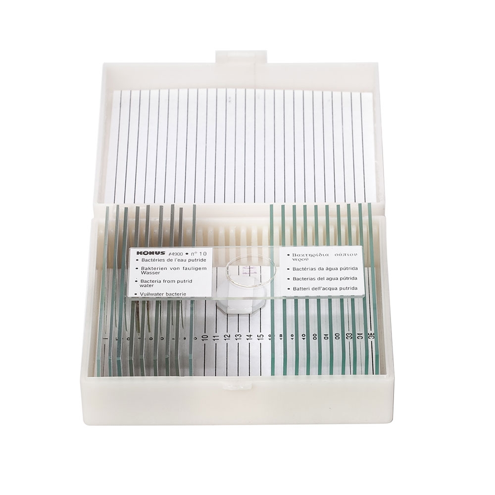 Набор из 10 подготовленных слайдов в удобной коробочке. Внутри Вы найдете не только подготовленные образцы, а и набор из пустых предметных и покровных стекол (10 шт) для создания собственных слайдов.