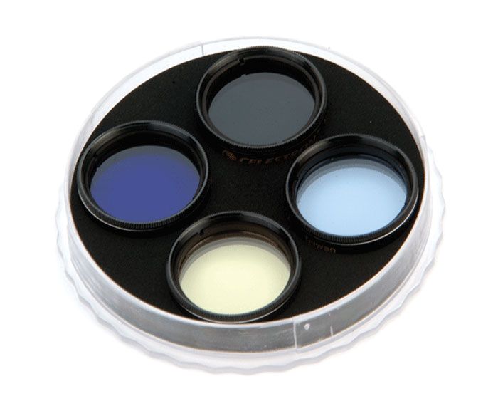 Предлагаемый набор состоит из четырех светофильтров с посадочным диаметром 1,25 дюйма. Все фильтры имеют световой диаметр 26 мм и заключены в оправу из черного анодированного алюминия. Фильтры изготовлены из полированного плоско-параллельного оптического стекла и покрыты антибликовым покрытием для минимизации искажений и повышения контраста. Каждый фильтр имеет две резьбы – это дает возможность складывать фильтры вместе для комбинированной фильтрации входящего света. Названия фильтров выгравированы на боковой поверхности оправы.