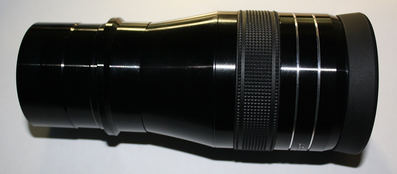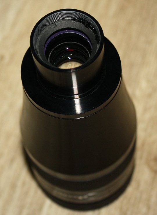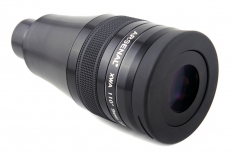 Окуляр также поражает своими размерами (общая длина окуляра составляет 150.6мм) и весом в 592 грамма. Все поверхности окуляра (за исключением оптики, конечно же) выкрашены в благородный матовый черный цвет. Форма у окуляра не совсем классическая и представляет собой два цилиндра, объединенные конусным переходом. Глазная линза закрыта крышечкой, сделанной из умеренно жесткой резины. Крышка снимается легко, но держится вполне надежно. Наглазник у окуляра пластиковый, выкручивающийся. Величина хода наглазника составляет  7мм. Однако, даже при минимальной высоте наглазника лично мне едва хватает выноса зрачка даже при наблюдениях без очков. Если же наглазник выдвинуть, то поле зрения резко сужается. Для людей, вынужденных для борьбы с астигматизмом носить очки данный окуляр не подходит. К моему удивлению измерения показали, что вынос зрачка у окуляра оказался равным 14 мм, что не так уж и мало. Очевидно, что некоторые неудобства связаны с наличием большого поля зрения и других конструктивных особенностей данной модели.