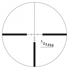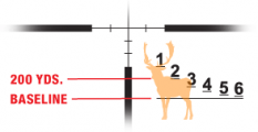 Измерение  дальности  до  цели с помощью  сетки 4В основано на сравнении реального размера цели с видимым. H - известный (реальный) размер (например высота тела оленя 0,5 м). Если   тело  оленя  помещается  между  нижней (baseline)  линией и линией с цифрой 2, то расстояние до оленя 200 метров.