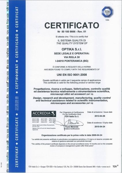 Вся продукция Optika SRL произведена в Италии. В небольшом городке Понтераника (провинция Бергамо) осуществляется разработка, производство и сборка микроскопов Optika. Каждый микроскоп сопровождается индивидуальным серийным номером, указанным на корпусе и в гарантийном талоне, а также отметкой о прохождении конечного контроля качества. Все изделия соответствуют основным требованиям соответствующих европейских директив ЕС и стандартам Европейского Союза.
