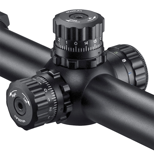 Барабаны ввода поправок по вертикали и горизонтали у прицела открытые, сконструированы по тактической схеме, и имеют цену деления 0.25 МОА. Такая тактическая конструкция позволяет легко вносить необходимые поправки по ходу стрельбы, что особо актуально при стрельбе на дальние дистанции. Для того, чтоб настройки случайно не сбивались во время стрельбы или транспортировки, под барабанами расположены зажимные винты-фиксаторы. Также конструкцией предусмотрена возможность калибровки барабанов для фиксации начальной точки ввода поправок на отметке "ноль".