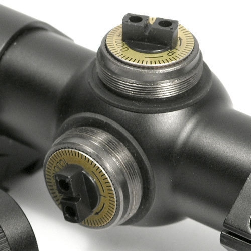 Барабаны ввода поправок по вертикали и горизонтали имеют цену клика 0.25 МОА и закрыты завинчивающимися алюминиевыми колпаками.