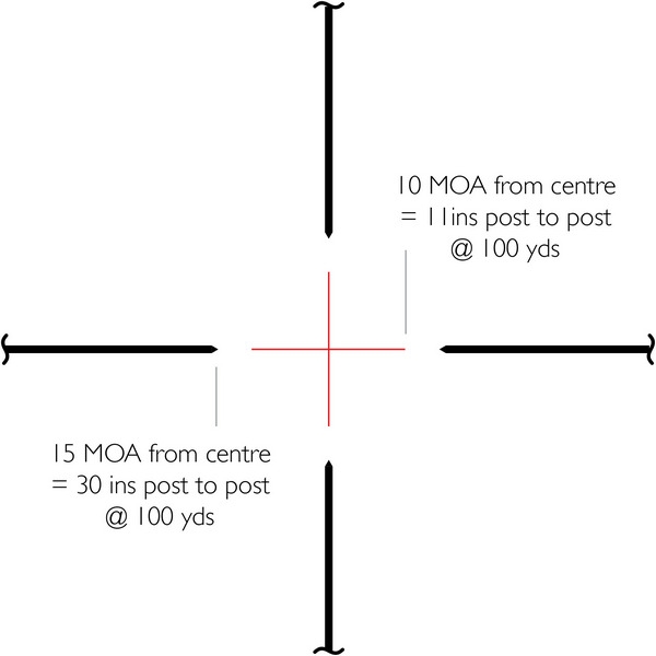 Прицельная сетка 30/30 или Duplex является одной из самых известных, простых и популярных. С ее помощью можно решить сразу несколько задач. Толстые внешние линии легко позволяют вести крупную мишень и выстрелить в нее навскидку. Тонкие линии дают возможность точного прицеливания в небольшую мишень. Тонкое перекрестие сетки 30/30 не затемняет цель и не сливается с темным фоном. Расстояние между краями противоположных линий сетки соответствует 30 дюймов на 100 ярдах при увеличении 4х, что также дает возможность приблизительной оценки дистанции до цели. Для другой кратности значения дальности рассчитываются методом интерполяции либо с помощью баллистического калькулятора X-ACT