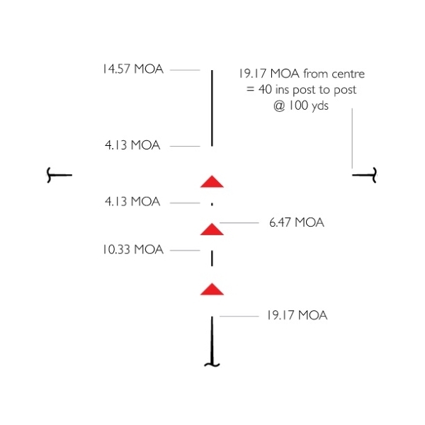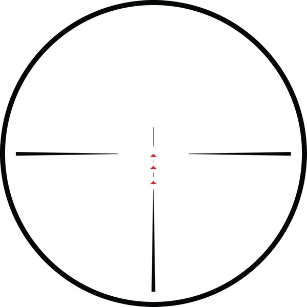Slug Gun SR IR - специальная упрощенная дальномерная сетка, разработанная компанией Hawke Optics для стрельбы на средние дистанции. Как видно из названия, сетка рекомендована для пулевой стрельбы из охотничьих ружей. Slug Gun SR IR имеет боковые тонкие линии, которые не перекрывают цель и при этом позволяют легко удерживать движущуюся мишень в поле зрения. В центре размещены три подсвечивающиеся треугольные метки, позволяющие вести прицельную стрельбу на дистанции от 100 до 200 ярдов с интервалом 50 ярдов. Единожды пристреляв прицел на расстоянии 100 ярдов, с помощью данной прицельной сетки можно легко определять траекторию пули на расстоянии 100, 150 и 200 ярдов. Данная прицельная сетка максимально проста и удобна в использовании, параметры сетки верны при увеличении 6х и начальной скорости пули в пределах 400-550 м/с. Для других параметров значения дальности рассчитываются методом интерполяции либо с помощью баллистических калькуляторов. Персональную адаптацию сетки под конкретное оружие и тип снаряда позволит совершить бесплатный баллистический калькулятор X-ACT
