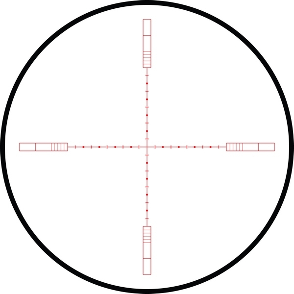 20х 1/2 Mil Dot IR - удобная универсальная сетка для максимально точного прицеливания на различных расстояниях. Главное отличие от обычной прицельной марки Mil Dot состоит в том, что тут имеются дополнительные пересечения, отмечающие пол мила. Все компоненты этой сетки имеют строго регламентированные размеры, расстояния между всеми элементами также регламентированы. Благодаря этому не проблема определить расстояние до цели либо размеры цели, приняв при этом правильную поправку на ветер и определить траекторию падения пули. Данный 1/2 Mil Dot верен при 20-кратном увеличении. Для других увеличений линейные и угловые размеры определяются методом интерполяции, либо по специальным таблицам. Персональную адаптацию сетки под конкретное оружие и тип снаряда позволит совершить бесплатный баллистический калькулятор X-ACT