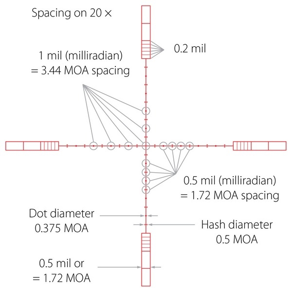 20х 1/2 Mil Dot IR - удобная универсальная сетка для максимально точного прицеливания на различных расстояниях. Главное отличие от обычной прицельной марки Mil Dot состоит в том, что тут имеются дополнительные пересечения, отмечающие пол мила. Все компоненты этой сетки имеют строго регламентированные размеры, расстояния между всеми элементами также регламентированы. Благодаря этому не проблема определить расстояние до цели либо размеры цели, приняв при этом правильную поправку на ветер и определить траекторию падения пули. Данный 1/2 Mil Dot верен при 20-кратном увеличении. Для других увеличений линейные и угловые размеры определяются методом интерполяции, либо по специальным таблицам. Персональную адаптацию сетки под конкретное оружие и тип снаряда позволит совершить бесплатный баллистический калькулятор X-ACT