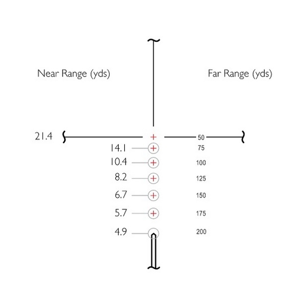 Rimfire .22 LR Subsonic - специальная сетка, разработанная компанией Hawke Optics для охотников на мелкую и среднюю дичь. Сетка максимально точно специализирована под винтовки для стрельбы патронами кольцевого воспламенения .22 LR (Калибр 5,6) с начальной скоростью полета пули 322 м/с, с высотой установки прицела 45 мм. Сетка имеет перекрестие типа Duplex со специальной разметкой, благодаря которой можно вести прицельную стрельбу с шагом в 25 ярдов. Единожды пристреляв прицел на расстояние 50 ярдов, с помощью данной прицельной сетки можно легко определять траекторию пули на расстоянии до 200 ярдов. Таким образом, максимальная дальность расчета траектории пули сходна с эффективной дальностью стрельбы патроном .22 LR. Параметры данной сетки верны при максимальном увеличении 9х. Данная прицельная сетка чрезвычайно проста и удобна и может использоваться с успехом также для стрельбы из пневматического оружия. Персональную адаптацию сетки под конкретное оружие и тип снаряда позволит совершить бесплатный баллистический калькулятор X-ACT.