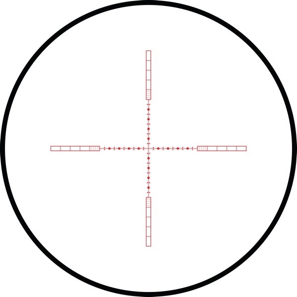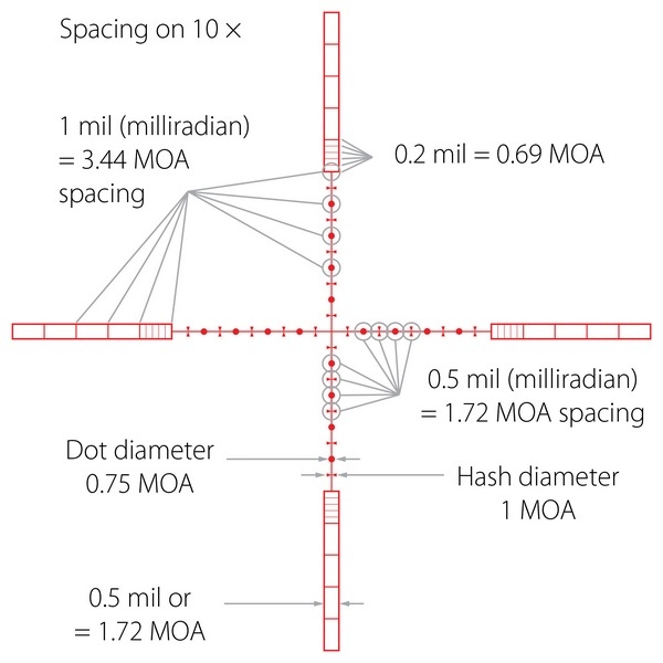 10х 1/2 Mil Dot IR - удобная универсальная сетка для максимально точного прицеливания на различных расстояниях. Главное отличие от обычной прицельной марки Mil Dot состоит в том, что тут имеются дополнительные пересечения, отмечающие пол мила. Все компоненты этой сетки имеют строго регламентированные размеры, расстояния между всеми элементами также регламентированы. Благодаря этому не проблема определить расстояние до цели либо размеры цели, приняв при этом правильную поправку на ветер и определить траекторию падения пули. Данный 1/2 Mil Dot верен при 10-кратном увеличении. Для других увеличений линейные и угловые размеры определяются методом интерполяции, либо по специальным таблицам. Персональную адаптацию сетки под конкретное оружие и тип снаряда позволит совершить бесплатный баллистический калькулятор X-ACT