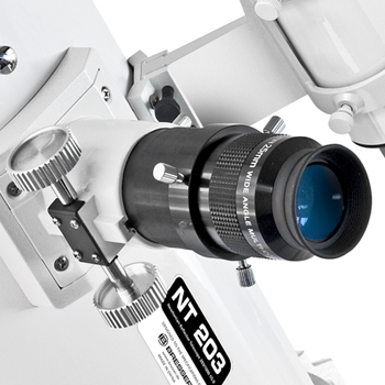 Монтировка EXOS-2 GOTO, которой комплектуется труба Bresser Messier NT-203, снабжена моторами по обеим осям, которые обеспечивают 9 различных скоростей ведения в диапазоне от однократной звездной скорости для сопровождения суточного движения светил до 4,5º в секунду для наведения на объект. Выбор объекта и управление телескопом осуществляется с помощью компьютерного контроллера Autostar #497, выполненного в виде ручного пульта с кнопками и дисплеем. Питание монтировки осуществляется от 8 батарей 1,5 В типа «D», которые устанавливаются в подвесной батарейный блок или, с помощью отдельно приобретаемого кабеля, от любого источника постоянного напряжения 12 В, в том числе от бортовой сети автомобиля. Для точного ориентирования полярной оси монтировка оснащена искателем полюса с подсветкой сетки и ручками плавной регулировки азимута и высоты оси. Стальная тренога имеет телескопическую конструкцию, и ее высота может настраиваться с учетом роста наблюдателя. Дополнительным элементом, придающим жесткость треноге, является практичная полочка для размещения на ней окуляров стандартов 1,25'' и 2''. Монтировка жесткая, выдерживает вес до 13 кг.