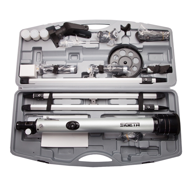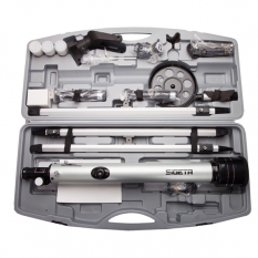 Sigeta Crux 60/700 – портативный телескоп начального уровня в удобном для переноски пластиковом кейсе. Удачная модель для желающих приступить к разгадке тайн звездного неба. Установлен на простую в управлении вилочную альт-азимутальную монтировку, тренога телескопа имеет полочку для аксессуаров.