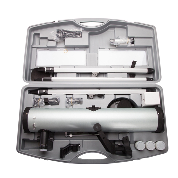 Телескоп SIGETA Virgo 76/700 - рефлектор со сферическим главным зеркалом поставляется в пластиковом переносном кейсе, в который вмещается и монтировка, и аксессуары. Алюминиевая тренога, на которую устанавливается прибор, регулируется по высоте и имеет полочку для аксессуаров.