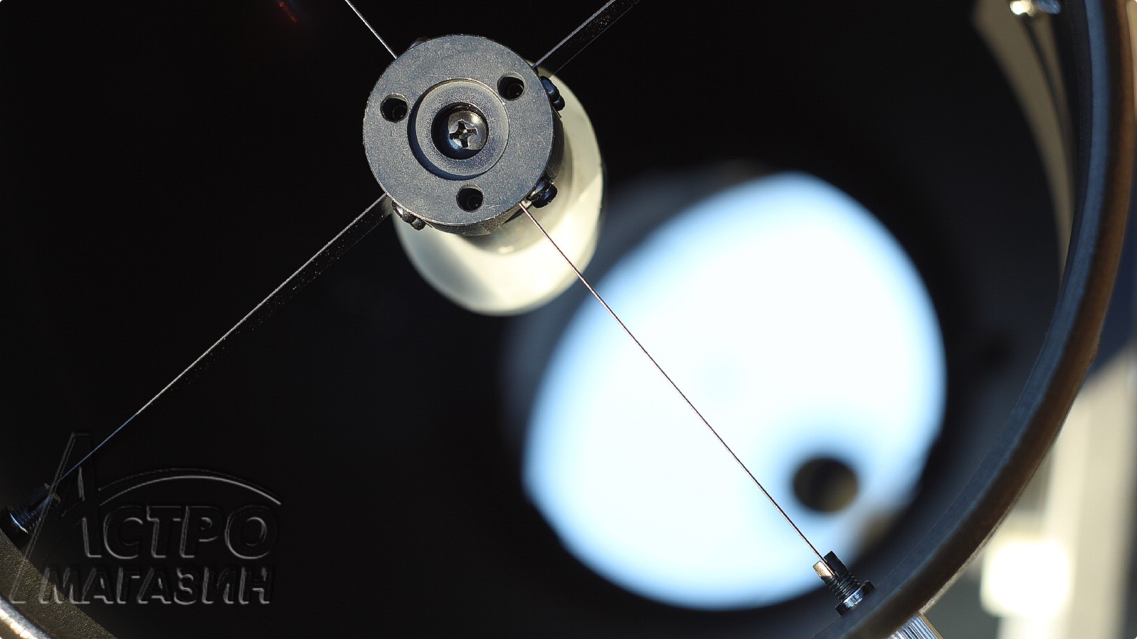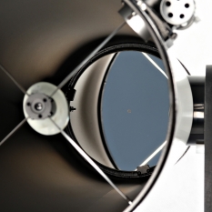 Вторичное плоское зеркало закреплено в типичной оправе на четырёх тонких растяжках. Его малая ось составляет 45мм, что обеспечивает телескопу центральное экранирование апертуры в 22%. Это очень немного, к тому же и светосила у зеркала невысокая. Так что DOB8 хорошо подойдёт для наблюдений не только дип-скай, но и планет.