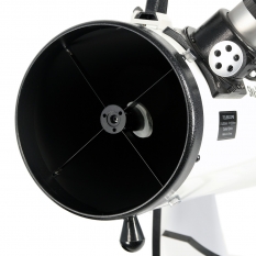 Оптическая труба телескопа свёрнута из тонкой листовой стали. Она усилена оправой главного зеркало внизу, и кольцом в верхней части. Эталоном жёсткости такую трубу, конечно, не назовёшь. И это будет заметно, если вы решите отъюстировать телескоп с помощью лазерного коллиматора. Он то и выкажет все огрехи механики, которая позволяет «уходить» лучу лазера при смене направления нагрузок на трубу. Впрочем, чем-то критичным это не является и визуальным наблюдениям особо не помешает.