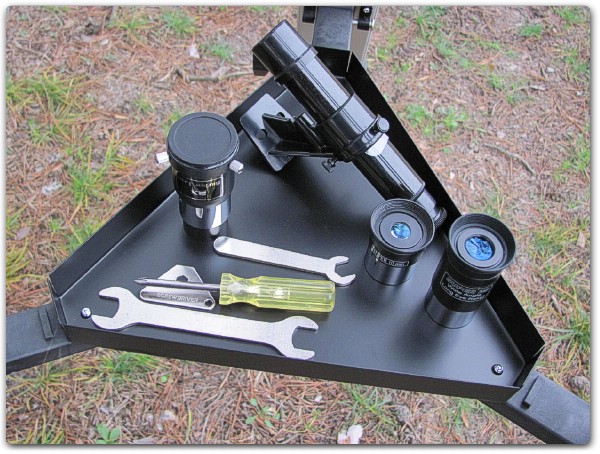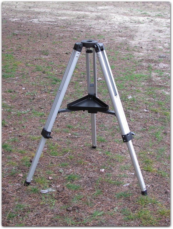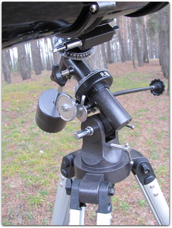 Телескоп оснащён вполне традиционной экваториальной монтировкой немецкого типа EQ2. С неё мы и начинаем сборку. После установки алюминиевой треноги, закрепляем на трёх внутренних растяжках полочку. Аксессуар этот очень важный – полочка помимо того, что создаёт дополнительное удобство, надёжно защищает штатив от случайного складывания и придаёт конструкции жёсткость.