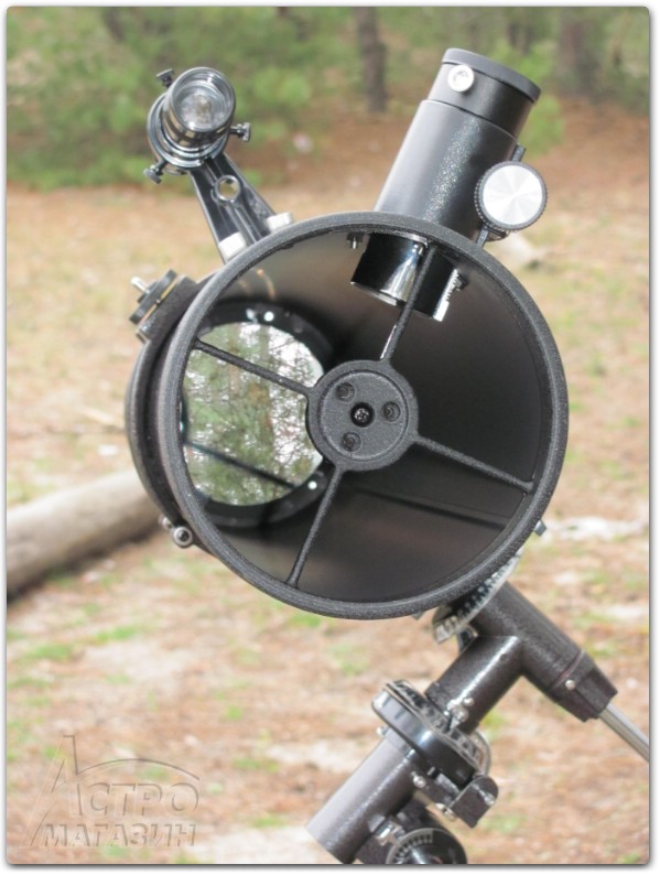 Вторичное зеркало находится в передней части трубы и закреплено в собственной оправе на цельнолитом четырёхлучевом «пауке». Сделано всё прочно, но, к сожалению, чрезмерно толстые растяжки постоянно напоминают о себе при наблюдении ярких объектов, оставляя на изображении четыре ярких луча.