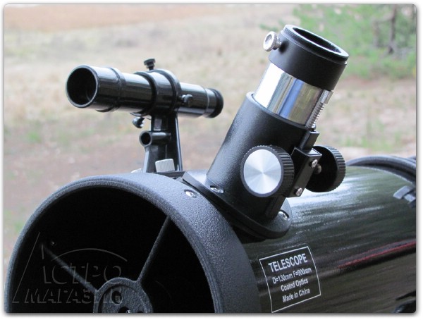 Для точного наведения трубы телескопа имеется небольшой искатель 5х24. Он крепится на пластиковую стойку с юстировочными винтами и перед наблюдениями должен быть настроен параллельно оптической оси телескопа. Сделать это несложно, можно навести трубу на удалённую возвышенность и юстировочными винтами добиться точной соосности. Исполнение искателя самое простое и бюджетное, но со своей ролью он справляется.