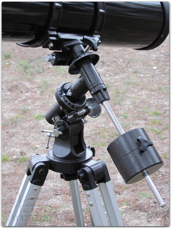 Голова монтировки крепится у вершины штатива с помощью центрального винта. Её сразу стоит сориентировать на север, а на шкале наклона полярной оси выставить широту места ваших наблюдений. Следующим шагом будет установка штанги противовеса и самого противовеса.