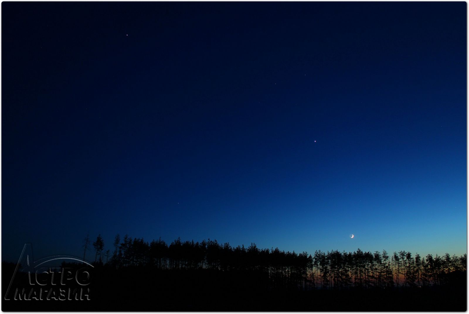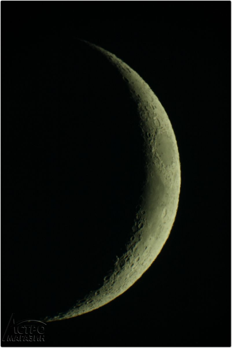Вечерняя заря была украшена узким серпиком молодой Луны неподалёку от яркой Венеры. С них наблюдения и начались. На Луне хорошо заметны очертания моря кризисов, тонкие детали рельефа и мутные пятна морей по ту сторону терминатора, которые выдаёт пепельный свет. На больших увеличениях цветная кайма хроматизма уже хорошо заметна. Телескоп светосильный и это своего рода плата за его высокую портативность.