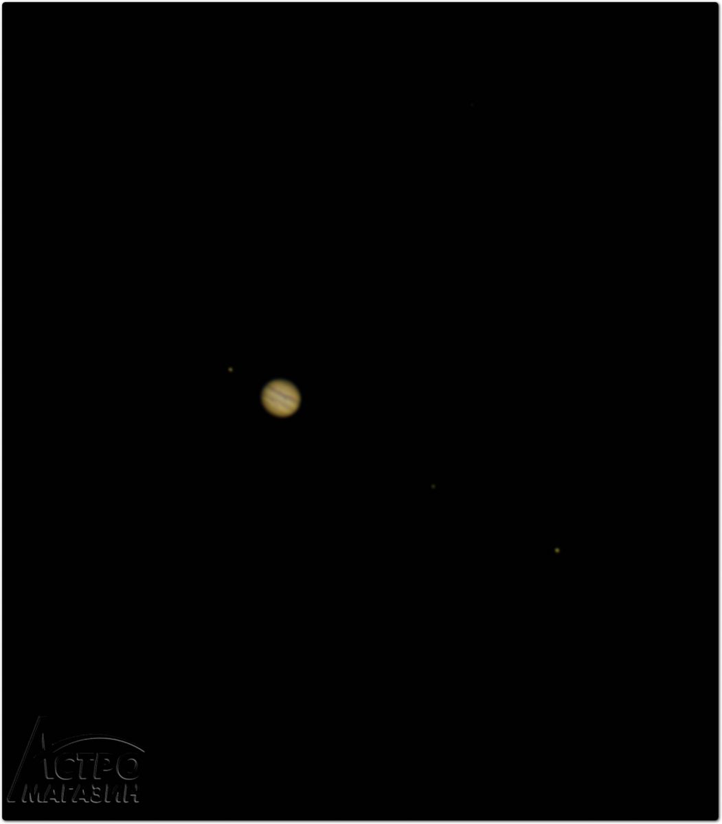 Вслед за Луной к западному горизонту следует и красавец Юпитер. 804-й уверенно показал две экваториальные полосы и околополярные образования, а также эстетичную картину четырёх галилеевых спутников.